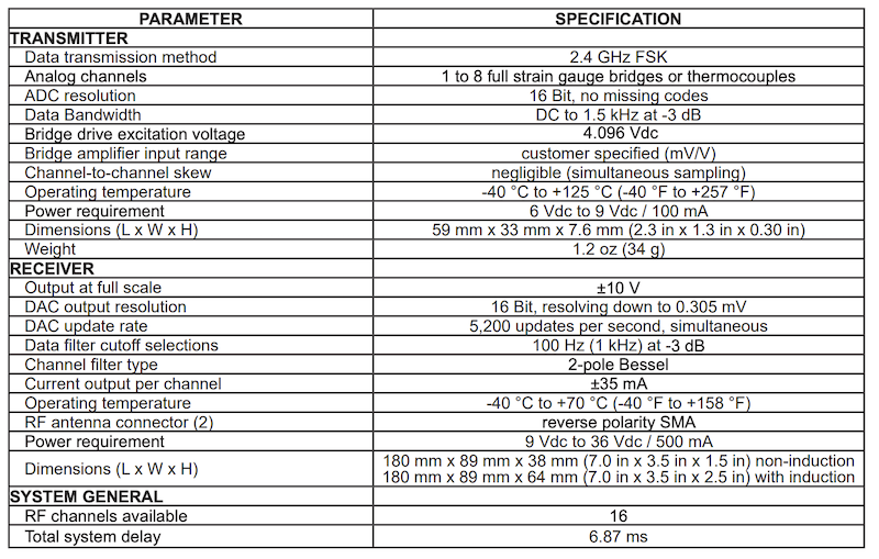 - Wireless transmission for up to eight channels of full strain gage bridge or thermocouple